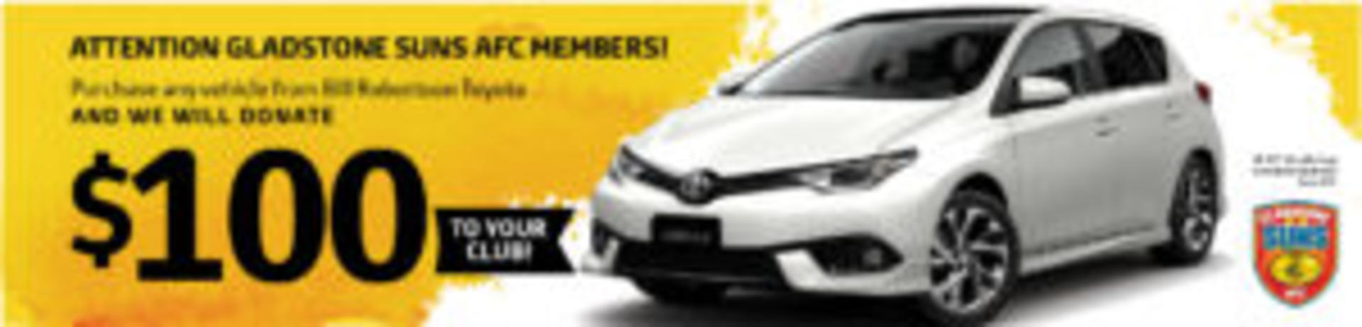 Bill Robertson Toyota is pleased to announce a special offer to all current Bill Robertson Toyota Gladstone Suns Members. With every purchase of a new or used vehicle by a Bill Robertson Toyota Gladstone Suns Club Member, the dealership will donate $100 back to the local AFL Club